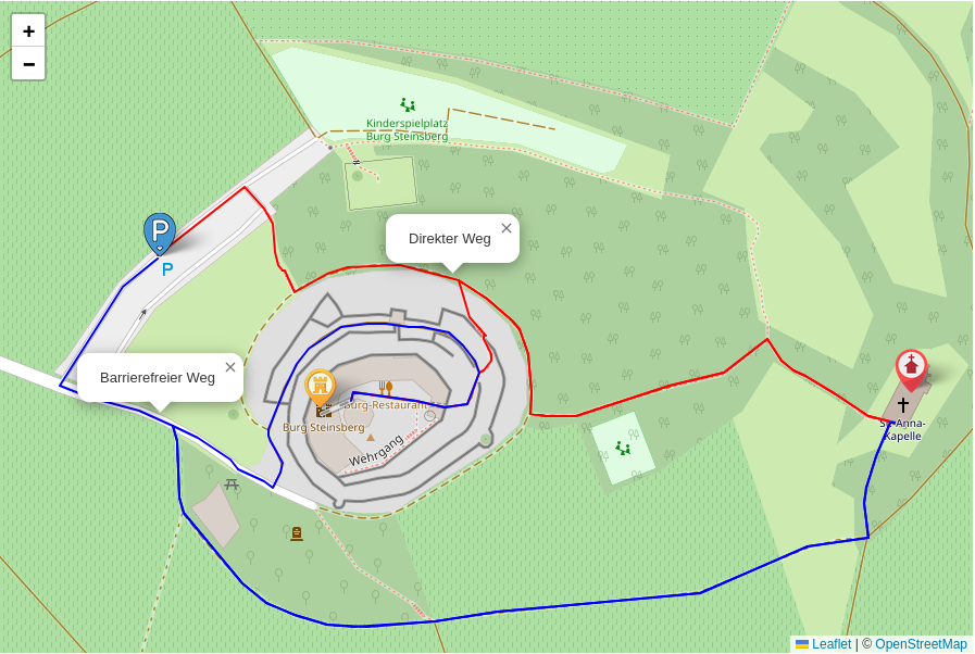 Der direkte Weg (in der Karte rot markiert) ist uneben und führt durch einen schmalen Waldweg, welcher zugewachsen sein kann.